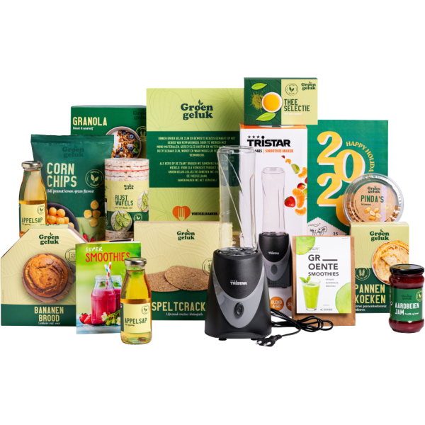| Inhoud | Smoothiemaker Tristar 13 x 13 x 37,5 cm met To-Go reisbeker 0,5 ltr Appelsap BIO 250 ml 2 st Super Smoothies receptenboekje 12 x 17 cm - 32 + 4 paginas Bananenbrood mix 200 gr Pannenkoekenmix volkoren 300 gr Granola roast it yourself 100 gr Halva vruchtenjam aardbei 320 gr Thee selectie 3 smaken Pinda's gezouten BIO 150 gr Rijstwafels 100 gr Groentezaden en aarde in papieren zak: Spinazie- boerenkool- en brocollizaden. Bijgevoegde QR-code geeft toegang tot tips voor het zaaien en oogsten BIO Corn chips chili peanut lemon grass 75 gr Rustieke speltcracker BIO 4 st Gratis kaart met eindejaarspuzzel Voedselbank donatie €0,10 van de opbrengst van ieder product van de themalijn Groen Geluk. Verpakt in een feestelijke geschenkdoos 390 x 290 x 200 mm |