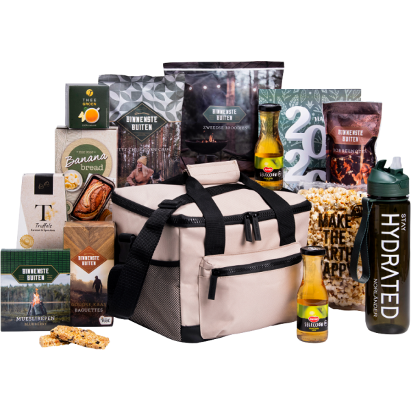 | Inhoud | Koeltas Nörlander RPET (duurzaam) Waterfles Nörlander 1 ltr Juver appelsap 20 cl 2 st Mueslirepen blueberry 60 gr 3 st Zweedse broodjes 150 gr Goudse kaas baguettes 75 gr Sweet chili corn chips 75 gr Borrelnoten 125 gr Truffels choco speculoos & caramel 50 gr Groene thee 10 zakjes BIO Popcorn 50 gr Mix voor bananenbrood 450 gr Gratis kaart met eindejaarspuzzel Verpakt in een feestelijke geschenkdoos 390 x 290 x 175 mm |