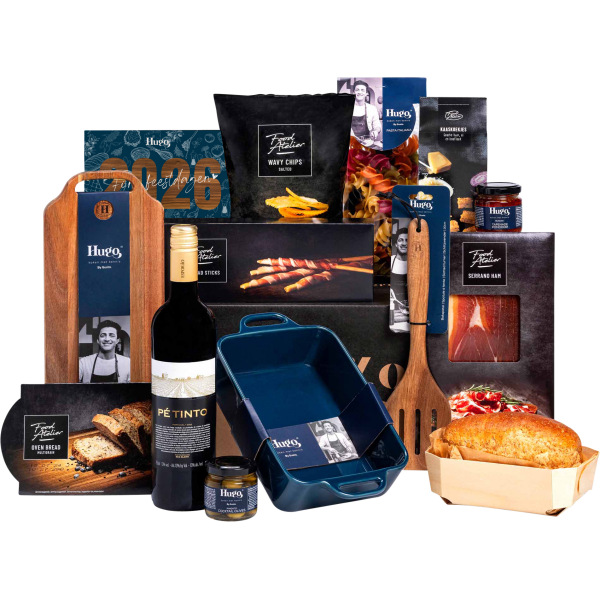| Inhoud | Hugo Kennis bakspatel Hugo Kennis ovenschaal 28,3 x 17 x 6,5 cm Hugo Kennis serveerplank 31,5 x 14 cm Pe Tinto Esporao 750 ml Serranoham 50 gr Grissini broodstengels 125 gr Kaaskoekjes 60 gr Bakbroodmix meergranen 350 gr Ribbelchips zout 90 gr Piment gevulde olijven 105 gr Tapenade olijf & knoflook 90 gr Fusilloni 6 colori Italian pasta 250 gr Gratis kaart met eindejaarspuzzel Verpakt in een feestelijke geschenkdoos 390 x 290 x 175 mm |