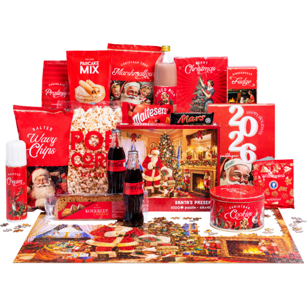 | Inhoud | Santa Presents puzzel 1000 stukjes Servetten 33 x 33 cm 2 st Coca Cola Zero 20 cl 2 st Koektrommel met kaneelkoekjes 150 gr Marshmallows boompjes 125 gr Fudge speculaas 110 gr Chocomelk 500 ml Slagroom 250 gr Bonbons 100 gr Ribbelchips zout 150 gr Pannenkoekenmix 180 gr Popcorn zout 100 gr Mars 51 gr Maltersers 37 gr Koekreep 90 gr Fortuin Wilhelmina pepermunt 65 gr Gratis kaart met eindejaarspuzzel Verpakt in een feestelijke geschenkdoos 390 x 290 x 200 mm |