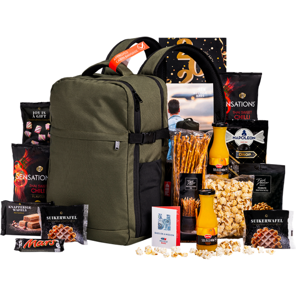 | Inhoud | Reistas Recycle bags underseater olijfgroen 29 x 18 x 40 cm (RPET duurzaam) inhoud 21 ltr en past onder de vliegtuigstoel en mag gratis mee als handbagage. Tas voorzien van laptopvak diverse opbergvakken Juver sinaasappelsap 20 cl 2 st Pretzelsticks XXL 200 gr Gezouten pinda's 100 gr Lay's Sensations Thai Sweet Chilli 40 gr 2 st Suikerwafel 55 gr 2 st Napoleon dropkogels 80 gr Popcorn zoet 50 gr Mallowmix 25 gr Hazelnootwafel 60 gr Mars 51 gr Gratis kaart met eindejaarspuzzel Verpakt in een feestelijke geschenkdoos 490 x 290 x 150 mm |