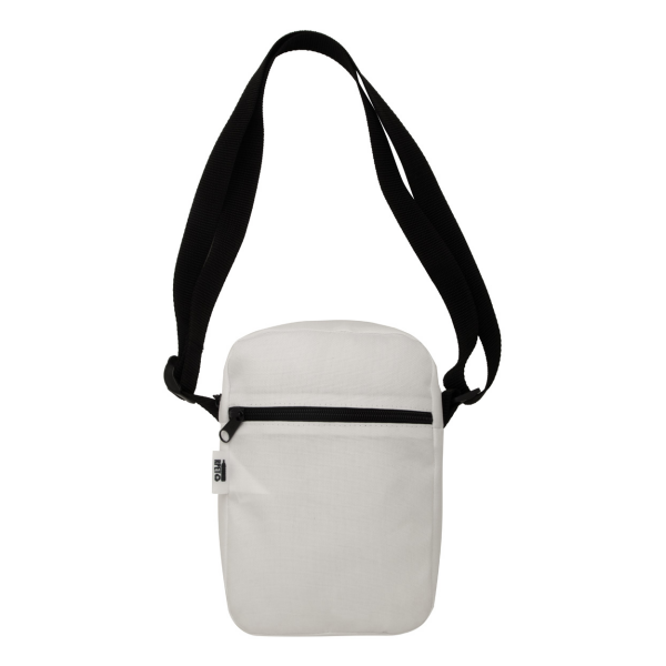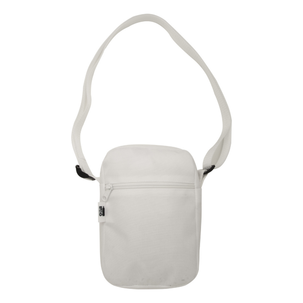 Custom made verticale schoudertas van 600D RPET polyester met ritsvak en voorvak. Met all-over sublimatiebedrukking en onderscheidend RPET-label. MOQ: 25 stuks.
