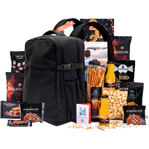 | Inhoud | Reistas Recycle bags underseater zwart 29 x 18 x 40 cm (RPET duurzaam) inhoud 21 ltr en past onder de vliegtuigstoel en mag gratis mee als handbagage. Tas voorzien van laptopvak diverse opbergvakken Juver sinaasappelsap 20 cl 2 st Pretzelsticks XXL 200 gr Gezouten pinda's 100 gr Lay's Sensations Thai Sweet Chilli 40 gr 2 st Suikerwafel 55 gr 2 st Napoleon dropkogels 80 gr Popcorn zoet 50 gr Mallowmix 25 gr Hazelnootwafel 60 gr Mars 51 gr Gratis kaart met eindejaarspuzzel Verpakt in een feestelijke geschenkdoos 490 x 290 x 150 mm |